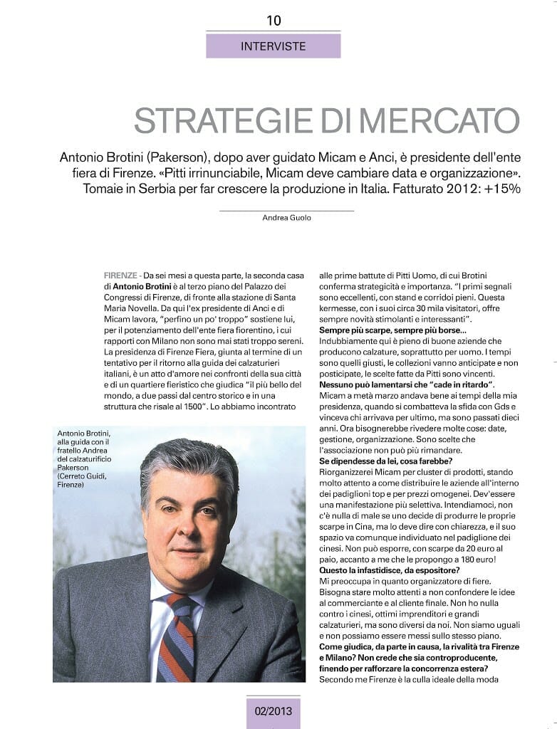 Antonio Brotini (Pakerson), dopo aver guidato Micam e Anci, è presidente dell’ente fiera di Firenze. “Pitti irrinunciabile, Micam deve cambiare data e organizzazione”. Tomaie in Serbia per far crescere la produzione in Italia. Fatturato 2012: +15%