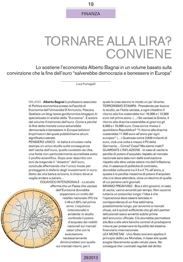 Tornare alla lira? Conviene 18 Set 2013 Lo sostiene l’economista Alberto Bagnai in un volume basato sulla convinzione che la fine dell’euro “salverebbe democrazia e benessere in Europa”. Tratto da Mdp La Conceria, n.29/2013
